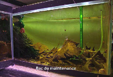 - Ce bac est composé comme la plupart de mes bacs : - - - - - - - Les oeufs sont principalement déposés sur le mop de fond. Je les récupère un à un à la main pour une incubation séparée des adultes en les plaçant dans un petit récipient contenant la même eau que le bac de ponte. Principalement les premiers jours je vérifie les oeufs afin d’éliminer ceux qui blanchissent pour éviter qu’ ils ne contaminent les oeufs voisins. En général il y en a très peu de non fécondés. A une température de 21°C le temps d’ incubation est d’ environ 3 semaines. On peut réduire ce temps à une température plus élevée. Dès la naissance je nourris les alevins de microvers et après quelques jours à l’ aide de nauplies d’ artémias. Je n’ ai pas essayé l’ incubation sur tourbe humide. Il est possible d’ obtenir quelques jeunes en reproduction naturelle. Leur croissance sera plus rapide mais le nombre d’ alevins sera limité à cause du cannibalisme. Aphyosemion jeanhuberi est un poisson relativement nouveau chez les killiphiles mais, par sa facilité de maintenance, de reproduction et son manque de timidité, on peut être certain qu’ il gagnera sa place parmi eux. Poisson qui peut être conseillé aux killiphiles débutants. |
