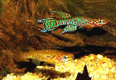 - - - - - - Pour la reproduction j’ utilise une eau à 80% de pluie + 20% du robinet. La température est de 22°C et le pH légèrement acide. Les oeufs adhésifs, relativement gros, sont déposés sur toutes les parties des différents mop ( flottants et fond ) avec une plus grande concentration sur le haut du mop flottant. Je les récupère un à un pour une incubation séparée des parents en les plaçant dans un petit récipient contenant la même eau que le bac de ponte. Principalement les premiers jours il est bon de contrôler l’ état des oeufs et d’ enlever ceux qui moisissent, ils ne sont pas fécondés , et risquent de contaminer les oeufs voisins. En général j’ ai très peu de pertes. A une température de 22 °C le temps d’ incubation peut s’ étaler sur 2 à 3 semaines. Dès la naissance je nourris les jeunes de microvers, puis de nauplies d’ artémias. Croissance relativement rapide. Je n’ ai aucune reproduction en naturelle . Les jeunes sont peut être dévorés par les adultes ? - - Certains auteurs le considèrent comme une sous espèce de A. elberti. Le Killi data, lui, le considère comme une espèce valide. Poisson de maintenance facile , non timide, que l’ on peut conseiller aux killiphiles débutants mais qu’ il est préférable de garder en bac spécifique. |