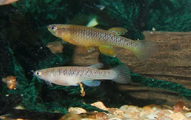 - - - - - - Mon couple est maintenu dans un volume net d’ environ 14 litres. Ce bac, comme tous les bacs de mes poissons, a un fond de sable neutre en partie recouvert de feuilles de chêne. Plusieurs mops, de fond et flottants , permettent à la femelle d’ y déposer ses oeufs. Ils servent également de refuges aux alevins qui apparaissent parmi les parents. Régulièrement je les récupère pour un élevage séparé des adultes. On peut également prélever les oeufs pour une incubation dans un petit récipient contenant la même eau que le bac de ponte. En fonction de la température le temps d’ incubation va de 2 à plus de 3 semaines . Il est possible de conserver les oeufs quelques jours sur de la tourbe humide avant la mise en eau. Dès la naissance les alevins sont capables d’ accepter les micro- Vu le manque de couleur du mâle la reconnaissance des sexes est relativement tardive. - |