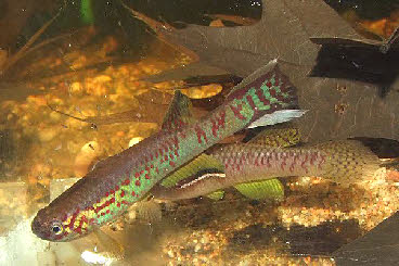 - - Les oeufs sont déposés sur les différents mops. On peut les récupérer un à un pour une incubation séparée des adultes en les plaçant dans un petit récipient contenant la même eau que le bac de ponte. Il est prudent d’ ajouter un antifongique afin de protéger les oeufs . En effet mes premières récoltes ont été détruites par des moisissures. J’ obtiens un meilleur résultat en conservant les oeufs sur tourbe humide pendant une période de trois semaines à une température de 23°C. Dès la naissance je nourris les alevins à l’ aide de microvers et de nauplies d’ artémias fraîchement écloses. Croissance lente. Pour l’ instant je n’ ai pas obtenu de jeunes en présence des adultes. L’ espèce est peu prolifique et à croissance lente. - - Par sa reproduction que je juge assez délicate et sa relative timidité c’ est une variété que je ne conseille pas aux killiphiles débutants. A conserver en bac spécifique. |