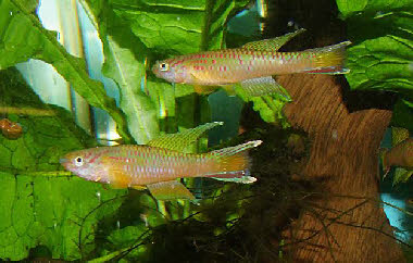 - - - - - - Il est possible de les récupérer pour une incubation séparée des adultes en les prélevant et en les plaçant dans un petit récipient contenant la même eau que le bac de ponte. Espèce assez prolifique mais à la croissance lente. Les jeunes sont sexués relativement tardet n’ ont pas la barre longitudinale foncée caractéristique de la plupart des A 23°C les naissances apparaîtront au bout d’ environ 2 semaines .Avec certains couples la reproduction naturelle peut donner de bons résultats. - - Assez différent des autres par sa taille assez importante ainsi que par ses couleurs. Il existe plusieurs souches de ce poisson qu’ il ne faut absolument pas croiser afin de garder des souches pures. Chromaphyosemion riggenbachi peut être conseillé aux killiphiles débutants. Si vous désirez davantage de renseignements sur les Chromaphyosemion je vous conseille le site de Monsieur LEGROS: http://www.chromaphyosemion.be |