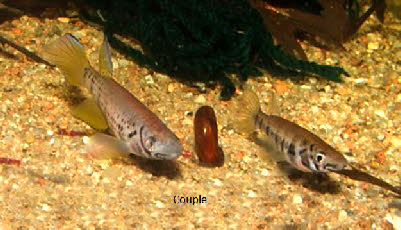 - - - - - - - Les oeufs, relativement gros et peu adhésifs, sont déposés sur les différents mops ( de fond et flottants ) avec une plus forte densité sous le flotteur du mop flottant , là où la laine est la plus serrée. Je récupère les oeufs un à un et les place dans un petit récipient contenant la même eau que le bac de ponte. Les 2 ou 3 premiers jours il faut vérifier leur état afin d’ éliminer les non fécondés qui blanchissent et risquent de contaminer les oeufs voisins. En fonction de la température la durée d’ incubation peut aller de 2 à 3 semaines. A la naissance les alevins sont capables d’ accepter les nauplies d’ artémias, croissance assez lente. La reproduction naturelle me donne d’ excellents résultats mais pour obtenir suffisamment de jeunes il est préférable de les récupérer afin de les élever séparément des adultes. - - derrière la vitre frontale à attendre la nourriture. Sa facilité de reproduction en fait un hôte à la portée du killiphile débutant. De plus il peut s’ adapter au bac communautaire en compagnie de poissons sensiblement de même taille qui demandent les mêmes qualités d’ eau. et qui demandent les mêmes qualités d’ eau. Attention bac impérativement bien couvert afin d’ éviter les évasions. |