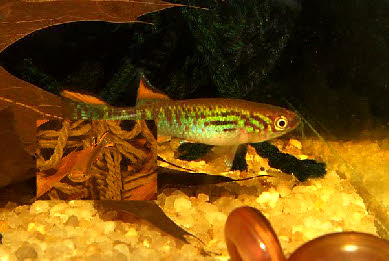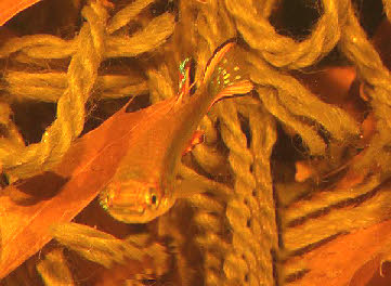 On trouve très peu de renseignements sur ce poisson. Tout ce qui suit résulte uniquement de mon expérience personnelle. - - - - coupée avec 25% d’ eau du robinet. Ce qui me permet d’ avoir une eau assez douce avec un pH autour de la neutralité et d’ une conductivité de 150 μS. - - Fond de sable neutre / Plusieurs mops ( de fond et flottants ) / Comme on peut le voir sur les différentes photos, quelques feuilles de chêne recouvrent une partie du fond / Une feuille de catappa / Légère filtration sur perlon. L’ eau utilisée a les caractéristiques énumérées ci- Contrairement à beaucoup d’ autres variétés , c’ est la femelle qui se montre la plus agressive ( du moins pour mon couple ) mais sans dommage pour le mâle qui trouve refuge parmi les différents mops. Régulièrement, environ tous les 15 jours, je récupère les petits oeufs qui sont déposés exclusivement sur le fond. Je les place sur de la tourbe humide et je les garde plus d’ un mois à une température de 25°C. Cette variété est assez prolifique et les jeunes grandissent relativement vite. - - |
