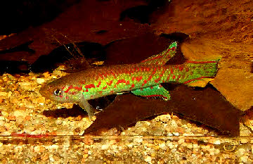 bon de contrôler l’ état de ceux- En fonction de la température le temps d’ incubation peut aller de 2 à plus de 3 semaines. Les alevins sont en rapport de la taille des oeufs , donc très petits, et doivent être nourris de paramécies et d’ anguillules du vinaigre. Après quelques jours les nauplies d’ atémias peuvent prendre le relais. Attention au cannibalisme, les plus gros alevins peuvent dévorer leurs jeunes frères, ceci est surtout valable dans une reproduction naturelle, dans ce cas il est souhaitable de déplacer les plus âgés dans un bac adéquat. Malheureusement le sexe ratio n’ est pas toujours bien équilibré, et la croissance est lente. De fréquents changements d’ eau permettent de maintenir le couple dans de bonnes conditions, ce qui favorisent les pontes. - - Scriptaphyosemion fredodi est endémique de la Sierra Leone . Sa conservation et sa reproduction nécessitent un minimum d’ expérience. |